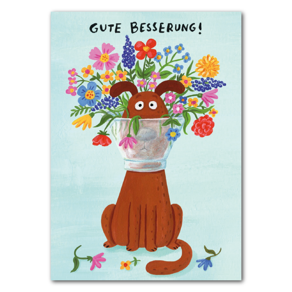 Die Gute Besserung Postkarte mit Hund und Blumen