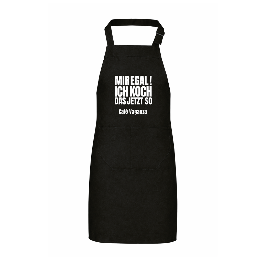 Die offizielle "Mir egal" Schürze von Café Vaganza mit mehrfarbigem DTF-Druck.