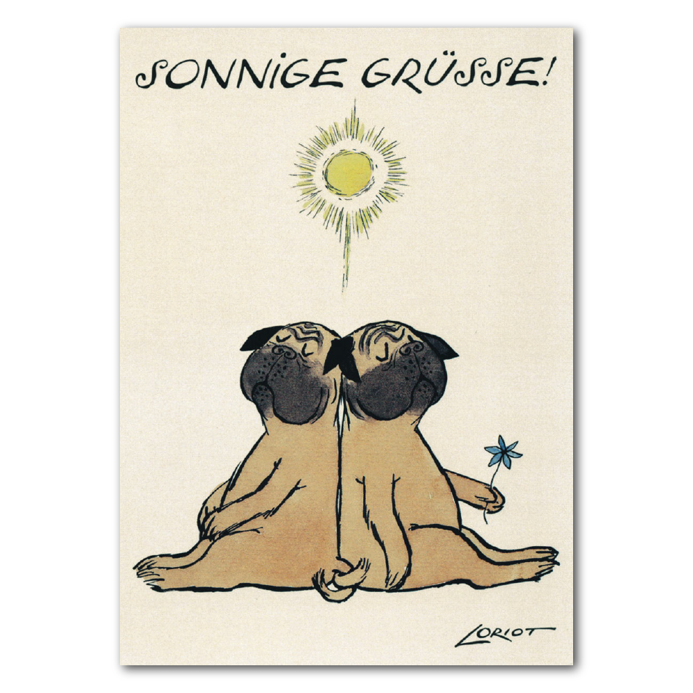 Die Sonnige Grüße Postkarte mit Sonne, Blume und zwei Hunden