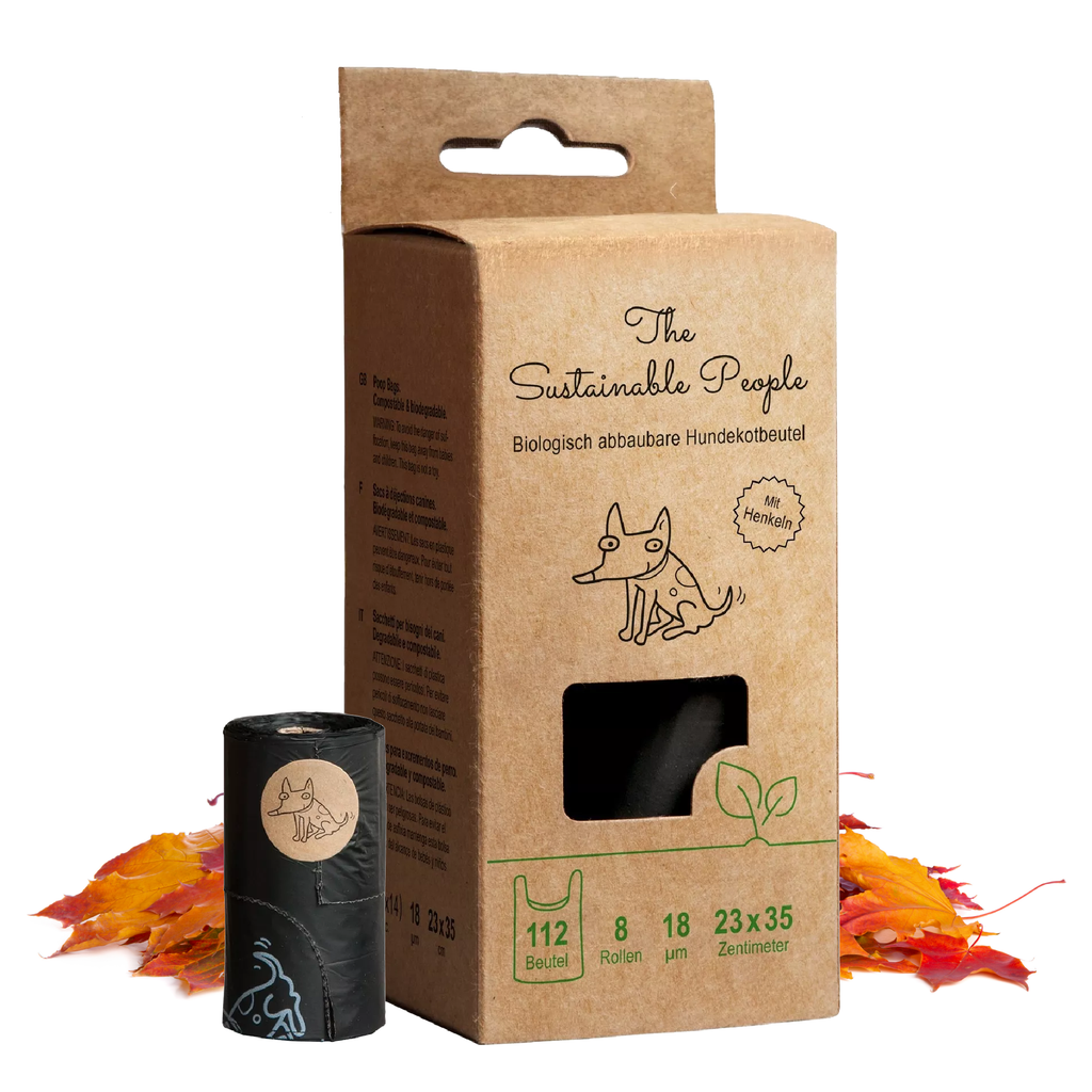 Biologisch abbaubare Hundekotbeutel in einer umweltfreundlichen FSC-zertifizierten Kartonverpackung - 112 Stück pro Packung - entsprechen der europäischen Norm EN 13432