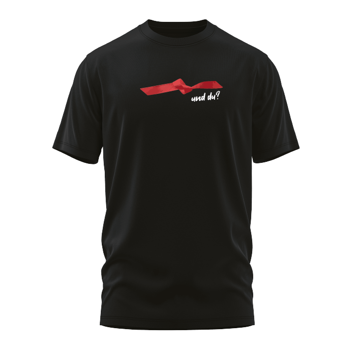 Das offizielle "Und du?" T-Shirt Schwarz von vergissaidsnicht.de mit mehrfarbigem DTF-Druck vorne und hinten.